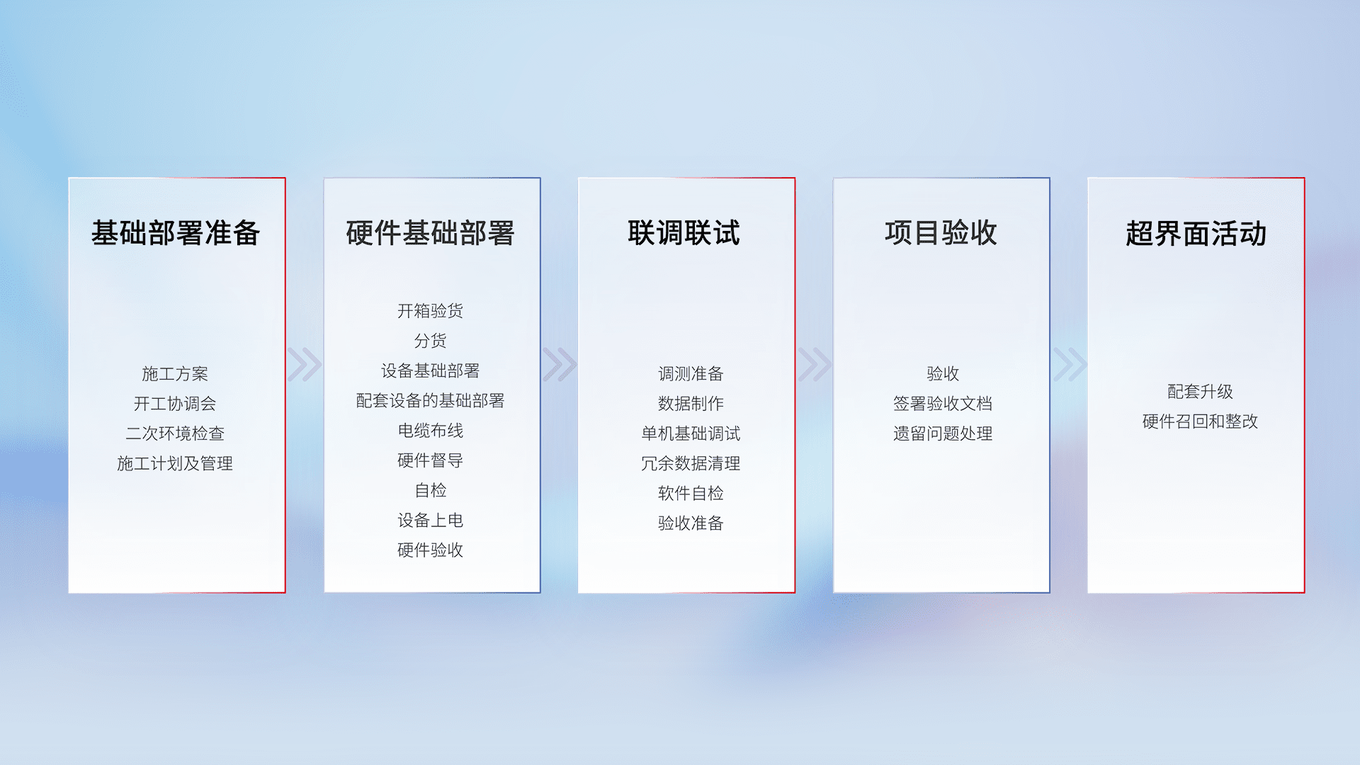 从基础部署准备、、硬件基础部署、、联调联试、、项目验收、、、、越界面活动的全过程可追溯,,保证施工质量和进度。。。